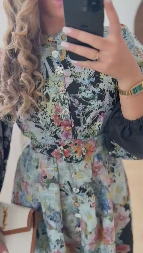 Robe imprimée Noir avec boutons bijoux sur tout le long de la robe.